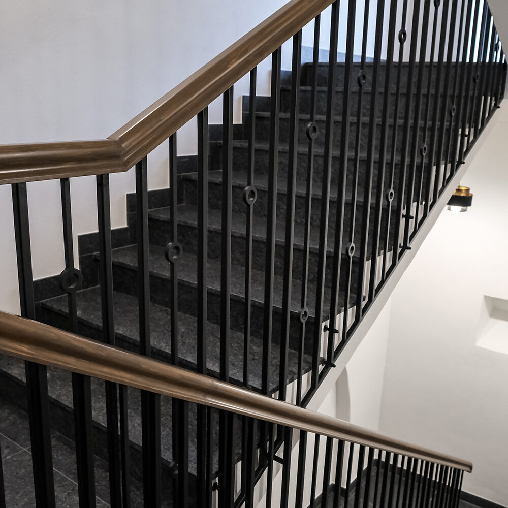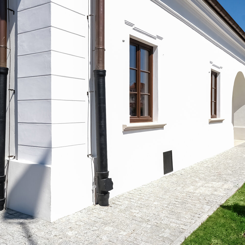 • Na zewnątrz odnowiono elewację i wykonano opaskę z kostki granitowej, przywracając budynkowi reprezentacyjny charakter w przestrzeni miejskiej.