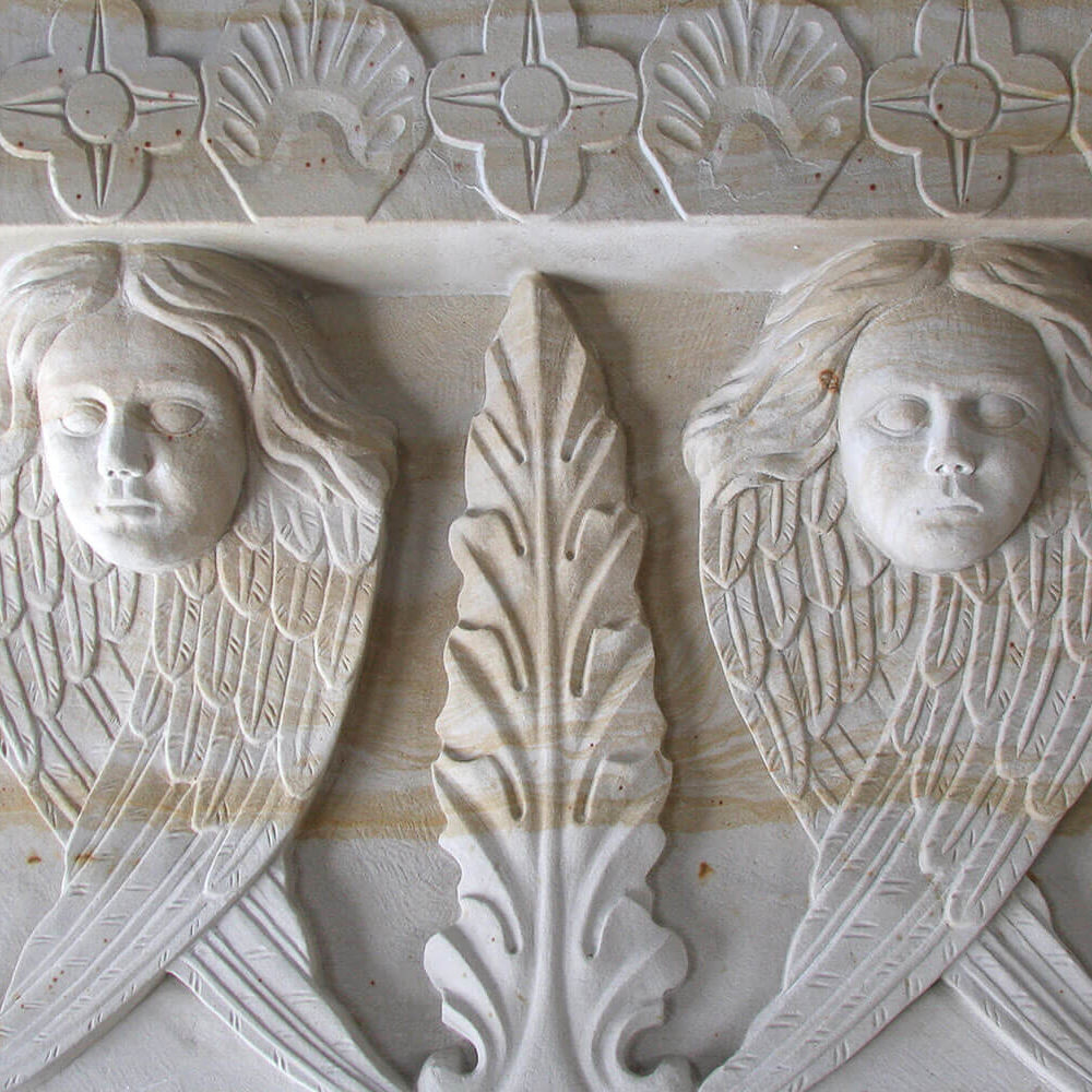 Detal wykonany z piaskowca Śmiłów, ręcznie rzeźbiony. Głowica kostkowa ozdobiona motywami roślinnymi w abakusie i płaskorzeźbami aniołów ze skrzydłami.