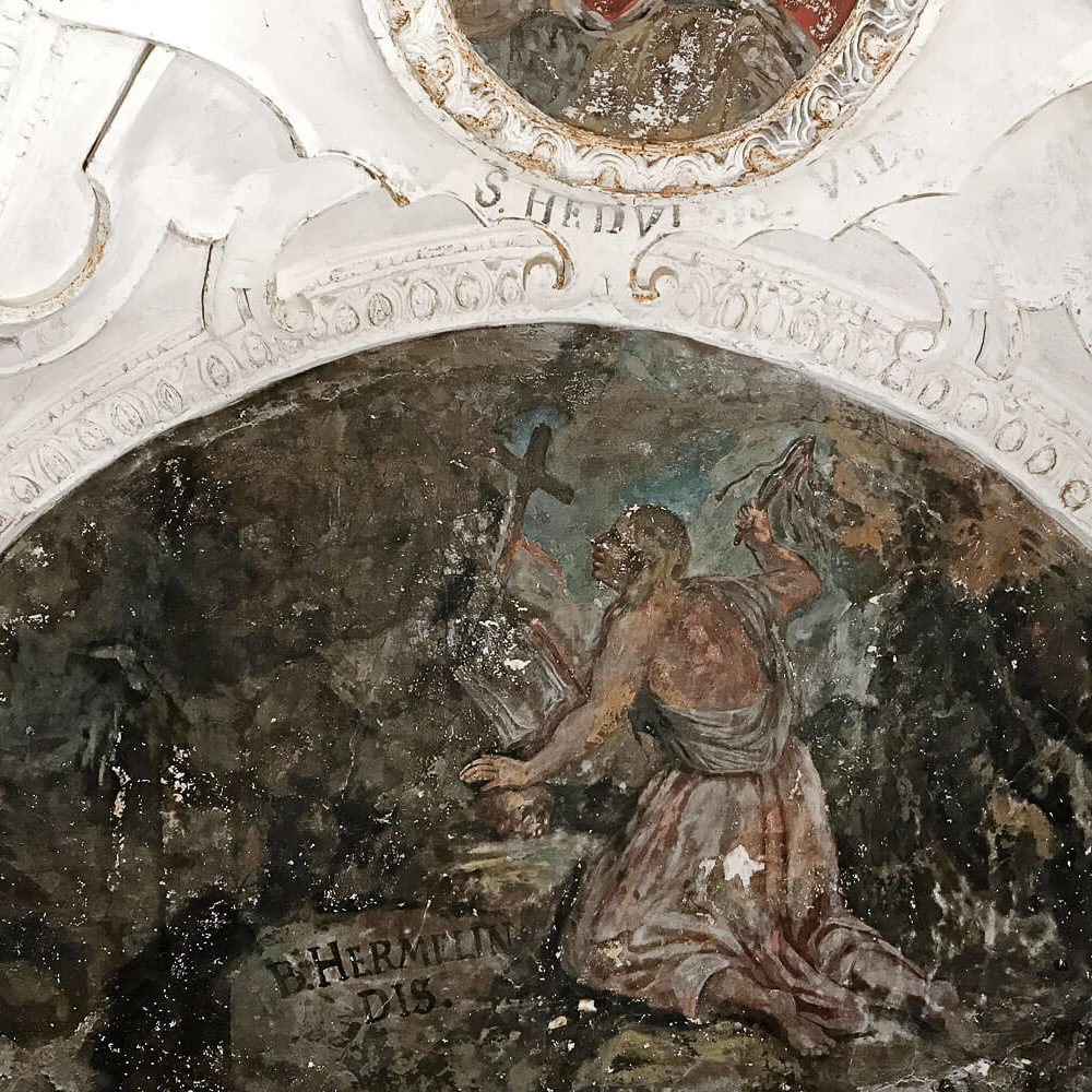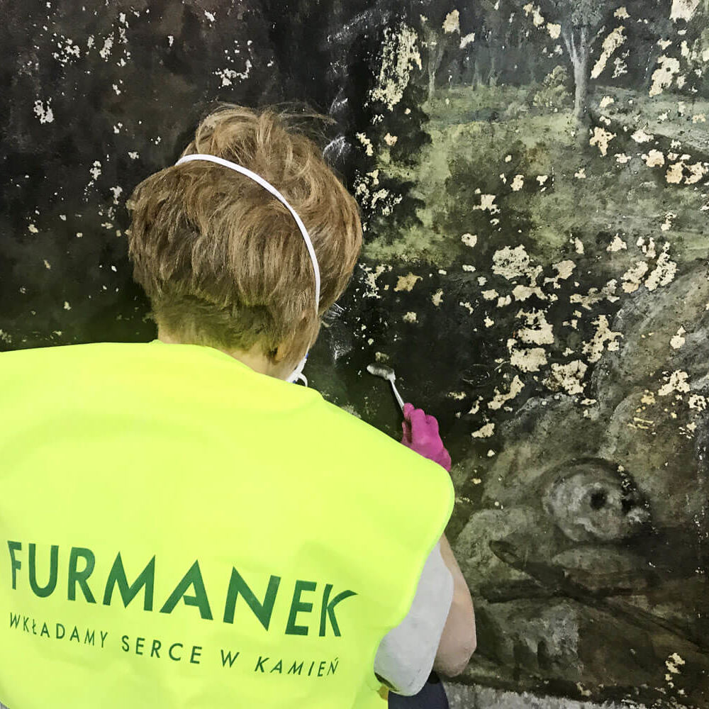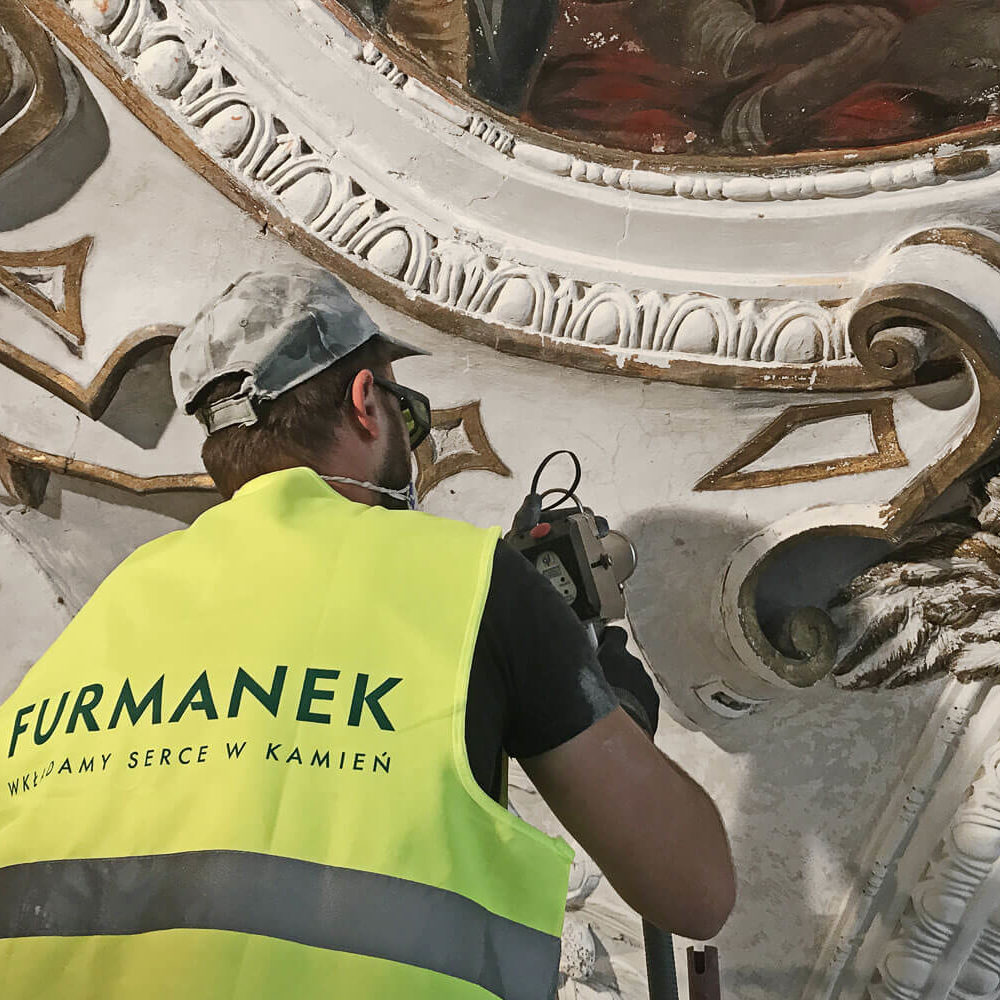 Tutaj również przeprowadzamy pełną konserwację, zarówno pięknego malarstwa temperowego Venanty da Subiaco i Jan Babtysta Falconi, jak i dekoracji sztukatorskiej. Tynki pobiałowe znajdujące się także w tej części sklepienia, poddajemy dokładnej renowacji w celu przywrócenia im dawnego blasku. Prace prowadzimy pod nadzorem Wojewódzkiego Urzędu Ochrony Zabytków Delegatura w Sandomierzu.